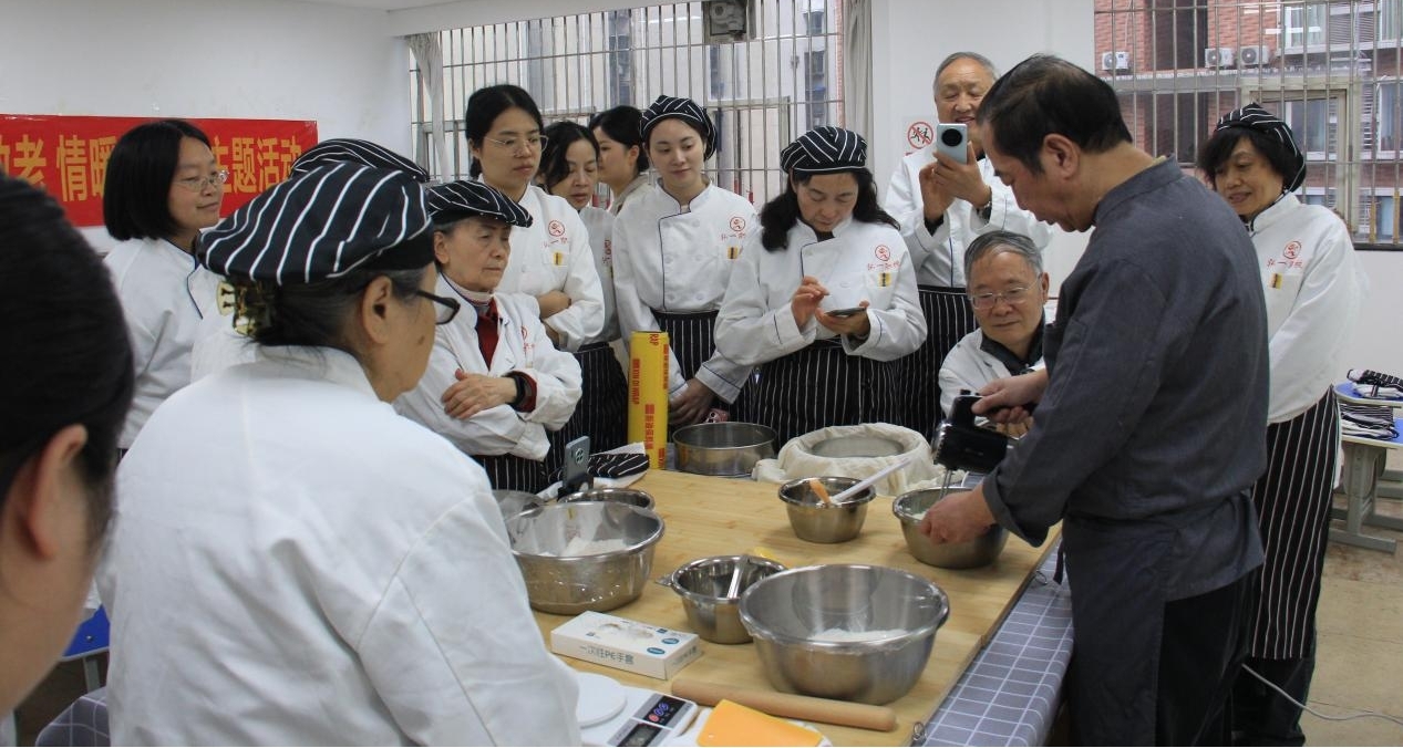 为让老前辈们渡过一个意义非凡的重阳节,弘一职校为他们定制了面点烘焙课,让他们在家也能制作符合老人们少糖、少盐的健康糕点。在核桃酥制作环节,老人们跟随老师揉面、包馅、压模,将核桃碎与红糖的香气融入酥脆面团中。“核桃酥要烤得金黄透亮,咬一口能听见‘咔嚓’声!”老师一边示范,一边耐心指导老人调整火候。72岁的李奶奶捧着自己制作的核桃酥笑道:“年轻时总给孩子们做点心,今天轮到自己当‘学生’,感觉又年轻了二十岁!”