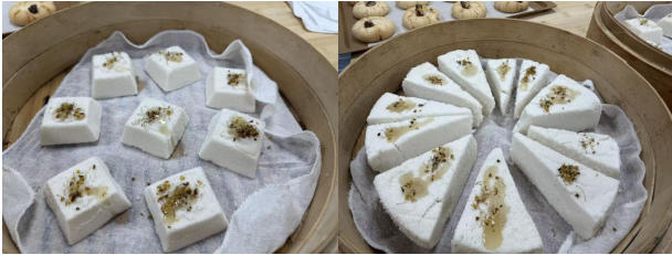 桂花松糕的制作则更添诗意。老人们将糯米粉与沾米粉按比例混合,过筛后铺入模具,再撒上当季金桂,最后用竹制蒸笼蒸制。随着蒸汽升腾,桂花香与米香交织弥漫,引得众人纷纷驻足。“松糕要蒸得蓬松不塌,秘诀在于筛粉时不能压得太实。”当一笼笼松糕出锅时,老人们迫不及待地品尝起来,软糯香甜的口感让现场掌声不断。