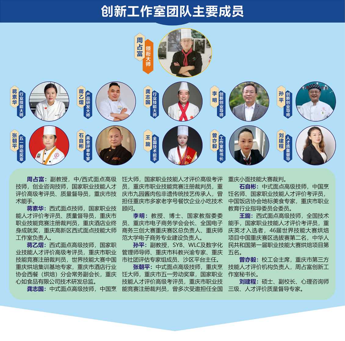 重庆市弘一职业培训学校周占富创新工作室是以全市技术能手周占富为领衔人,由行业点心技能大师、学校面点专业讲师、企业食品研发师和创新创业指导师组成团队,在2021年设立的校级周占富面点技能大师工作室基础上建立的。