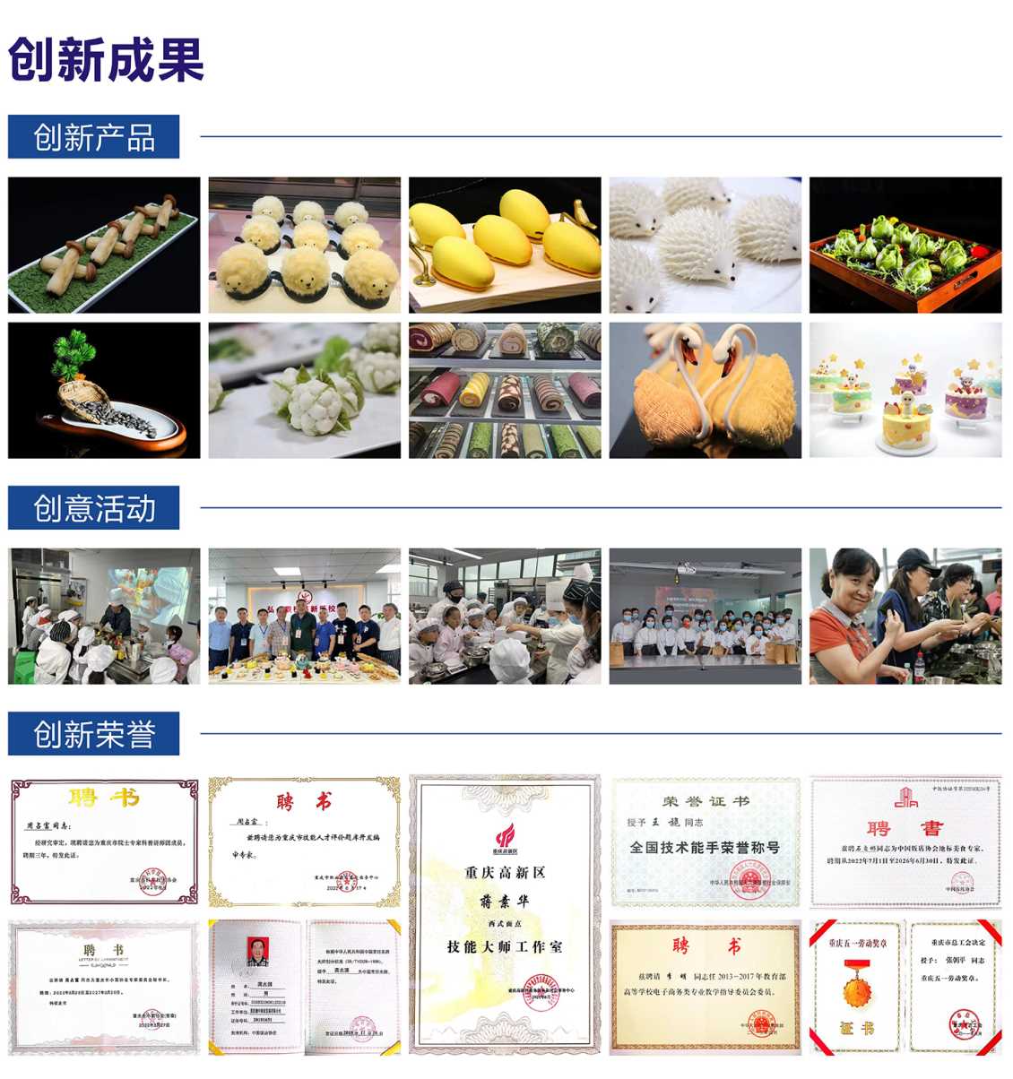 创新工作室自成立以来,团队成员完成中西面点师技能工种培训8期,参加社会烹饪科学技术科普服务4次,参与中西面点高技能人才评价工作16次,培养高技能人才30余人,担任各类技能竞赛专家、裁判10余次;同时,工作室领衔人周占富为重庆古昌食品股份有限公司研发的回锅肉烤包和富硒风味小吃,为企业赢得最大效益;成员蒋乙熠作为巴渝最美工匠,为重庆心如食品公司开发的数款甜品,深受社会民众称赞。
